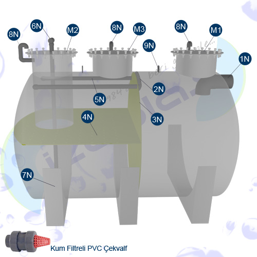 - 3N : 1. Hazne ile diğer hazneleri ayıran tamamen kapalı fiberglas ayırıcıdır.